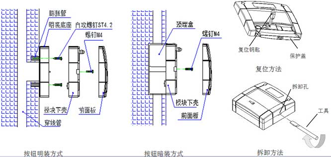 上图为消火栓按钮的安装方式,分别有安装方式和明装方式两种。